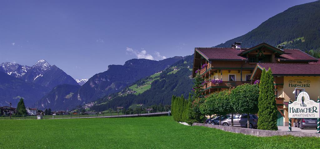 Relax & Lifestyle Apartments & Suites Villa Haidacher Our beautiful villa with is located in Zell am Ziller in the Zillertal valley. We rent apartments and studios designed for your relaxation and enjoyment. You can enjoy fantastic views of the Zillertal Alps from our central and beautiful location. We are located directly at the start of the Zillertal Mountain High Road, and you can reach the town center of Zell as well as the amusement park with many activities (tennis, ice skating, indoor sports, bowling, adventure playground, indoor and outdoor pool) in just a 3-minute walk. The luxurious, Tyrolean-style apartment-villa with six spacious apartments and two studios is located in a beautiful, sunny setting. We offer couples, families and singles a variety of amenities, as well as comfort and tranquility. We also welcome guests with a dog. The apartments are exclusively furnished and offer plenty of space (from 41 to 120 m²). They include fully equipped kitchens as well as Wi-Fi, full HD TV with four Sky TV channels (including Deutsche Bundesliga) and large balconies or terraces. Our apartment hotel is in the immediate vicinity (30 m) of the free ski bus, taking you to the Zillertal Arena which is just 1.5 km away. This is the largest ski area in the Zillertal Valley with 141 km of slopes and many attractionsfor skiers and snowboarders including action parks, gratis W-Lan and much more. Our guests also like to hike on the Ziller trail from where they can explore the Zillertal Valley. You may choose to go cross-country skiing, Nordic walking, biking or walking. In summer, (especially for guests with a dog) the beautiful trail along the river Ziller invite you for a walk. Or you may choose to explore one of surrounding mountains (Gerlosstein, Kreuzjoch Rosenalm) or go hiking and climbing on the Gerlosstein high rope course. For bikers, the Zillertal offers fantastic opportunities for beginners and experts cyclists. The Aparthotel Villa Haidacher has a ski room with boot dryers. Bicycles can be parked in the bike shed. There is a private parking lot next to the house. Indulge yourself in our stylish and well-equipped wellness area with Saunarium, which includes a revitalising Finnish sauna and soothing herb blossom steam bath (45 ° C). We look forward to your visit to the Villa Haidacher in Zell am Ziller! Your family Haidacher
