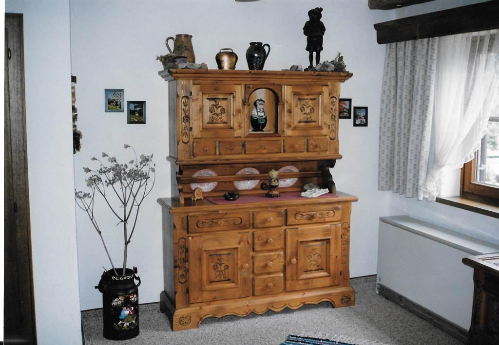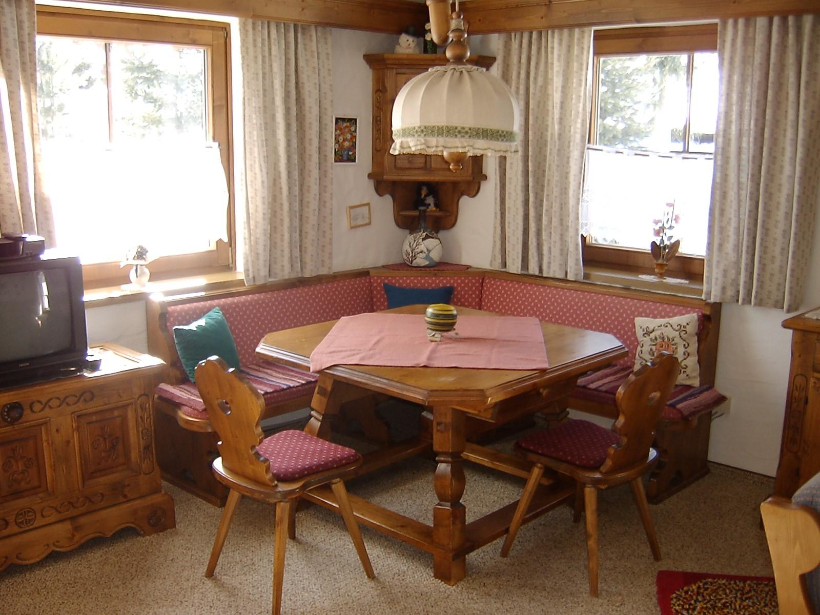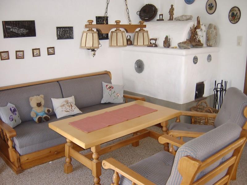--Grote woonkamer met tegelkachel en Vogelauer stijlmeubelen, zithoek, (uitklapbaar voor 2 pers), .Sat. TV, DVD-speler, radio, ingebouwde