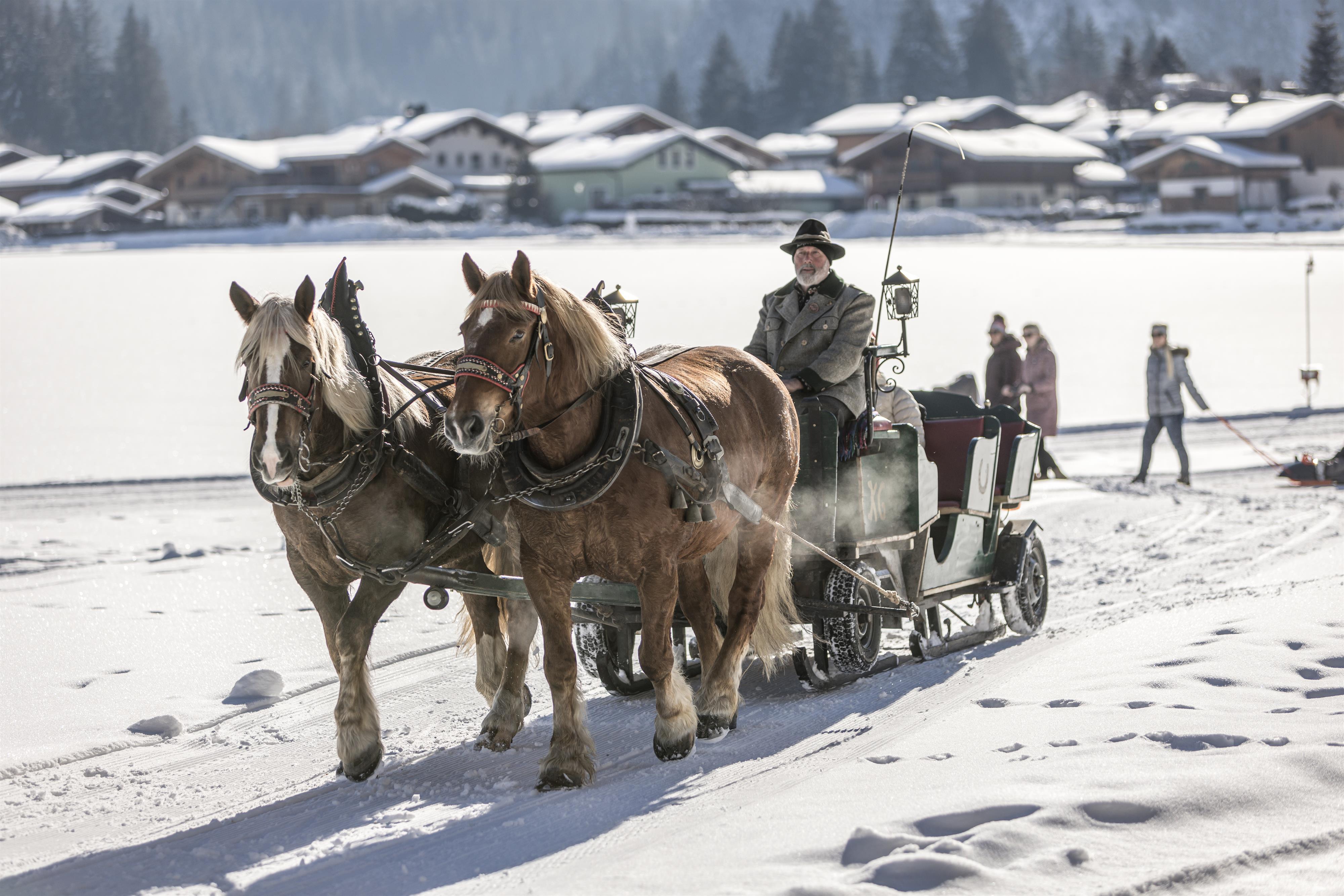 Omringd door glinsterende bergtoppen, diep besneeuwde bossen en romantisch gelegen dorpen glijdt u in een paardenkoets door het witte winterlandschap. Gewikkeld in warme dekens geniet u van de tijd met uw dierbaren en luistert u naar de klokken van het paardenspan. De romantische afwisseling in uw wintervakantie in het Pinzgau!