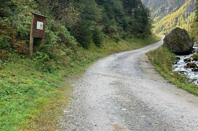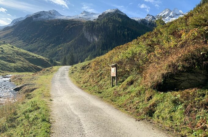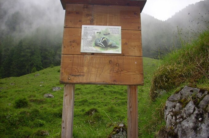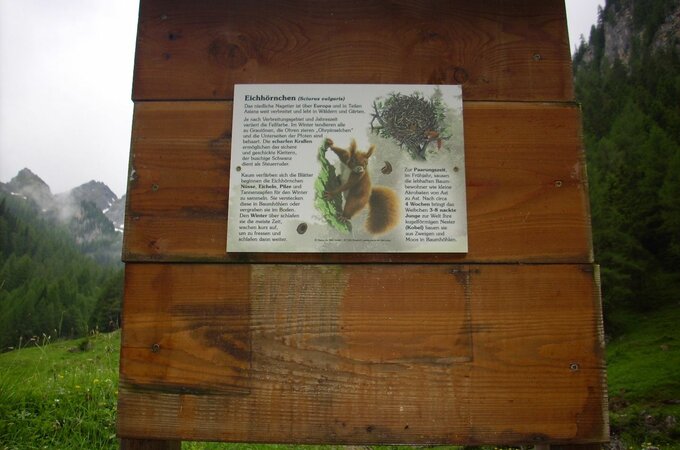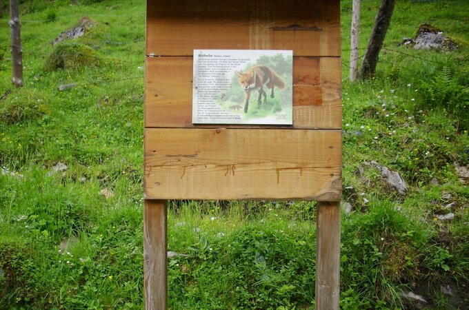 Entlang des Weges finden Sie Schautafeln mit heimischen Tieren (Gämsen, Adler, Murmeltier etc.)