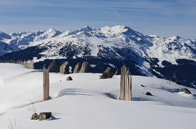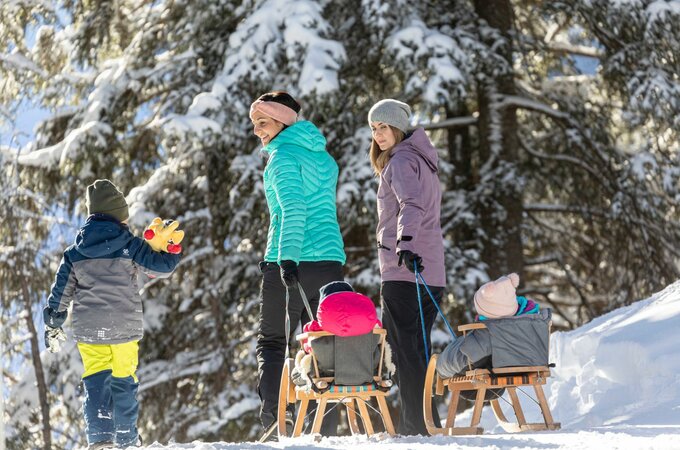 Rund um den Fichtensee erwartet dich ein stimmungsvoller Winterwanderweg, der dein Erlebnis auf der Rosenalm perfekt abrundet. Der leicht begehbare Rundweg eignet sich ideal für Familien und alle, die die ruhige Seite der winterlichen Bergwelt entdecken möchten. Auch wenn der See im Winter leer ist, bietet die weite, offene Fläche gemeinsam mit der umliegenden Landschaft eine eindrucksvolle Kulisse und immer wieder schöne Ausblicke.