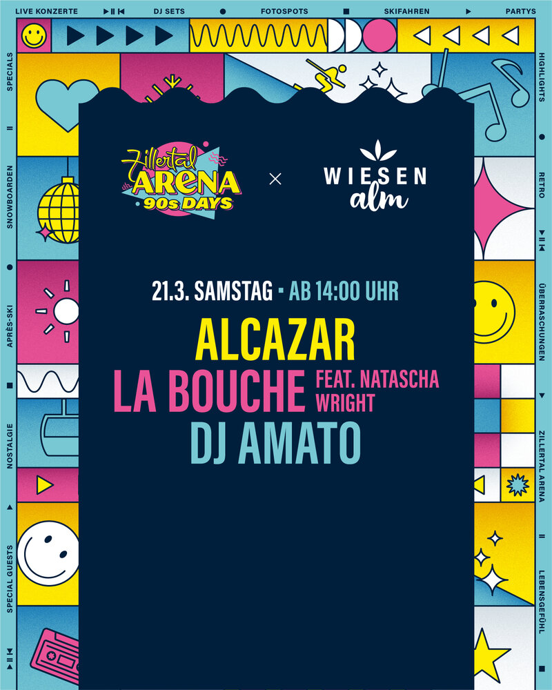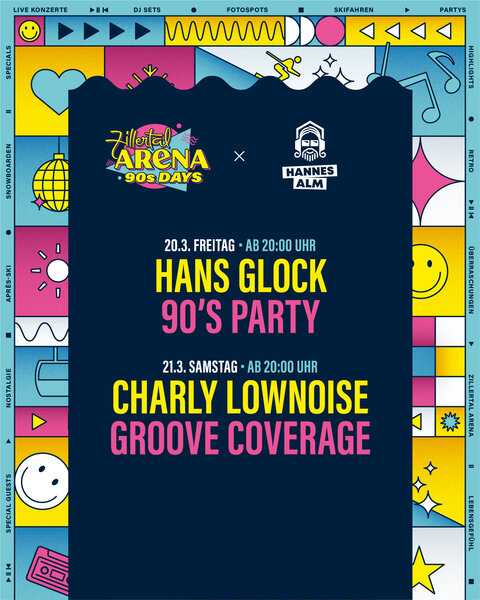 Vom 20. bis 22. März 2026 verwandelt sich die Zillertal Arena in eine Bühne für das legendäre Jahrzehnt der 90er Jahre! Ein Hauch von 90er Nostalgie in den Bergen: Das gesamte Skigebiet erstrahlt im Look & Feel der 90er, und mit Special Guests wird das Lebensgefühl dieser Ära wieder zum Leben erweckt. Bei den Arena 90s Days dürfen sich Gäste auf ein unvergleichliches Erlebnis freuen, das Nostalgie und Skivergnügen vereint. Neben den bekannten Live-Bands, die die größten Hits der 90er Jahre LIVE performen, sorgen DJs mit den angesagtesten Tracks für die perfekte Stimmung auf und abseits der Pisten.