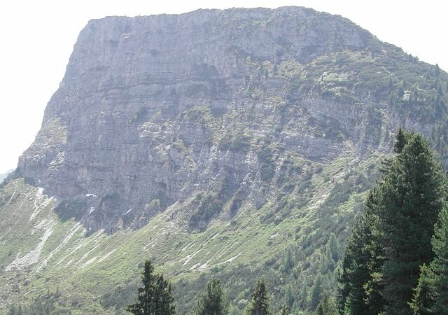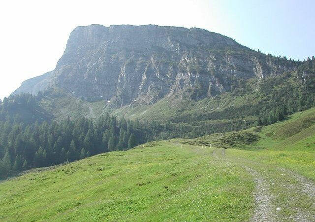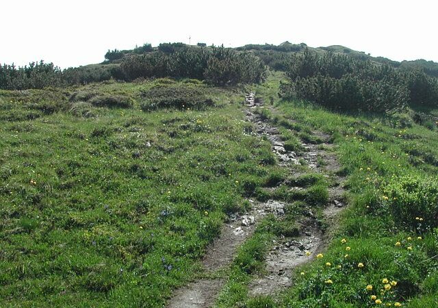 Die Fortsetzung des Weges geht nun leicht ansteigend im Latschenbereich zum Gipfel (2166m). Auf diesem Abschnitt ist eine Wegtafel die zur Kotahorn-Alm weist.